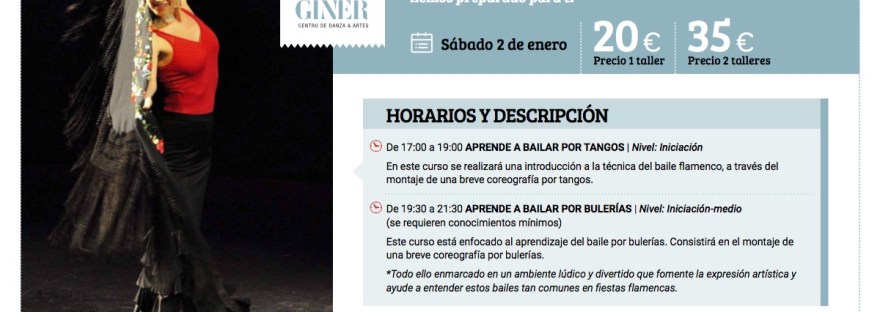 Ven a disfrutar el día 2 de enero de los talleres de flamenco que impartiré en el Centro de danza y artes Rocío Giner, y con los que aprender y pasar una tarde divertida bailando a compás de tangos y/o bulerías. 🙂